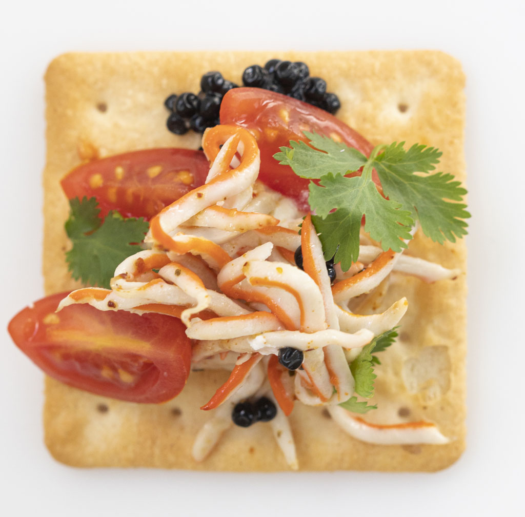 cangrejo, tomate cherry, caviar y
