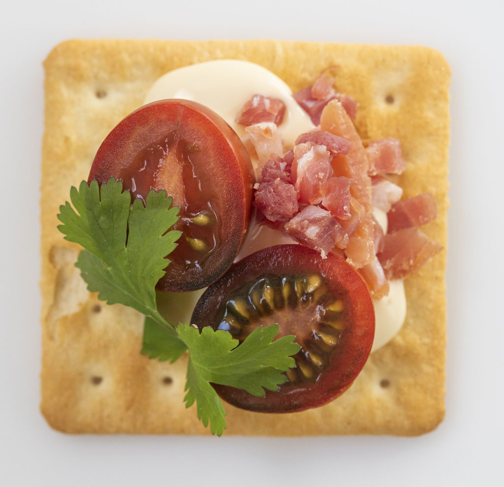crema de queso curado, tomate